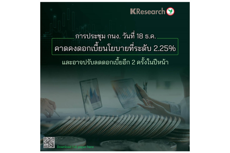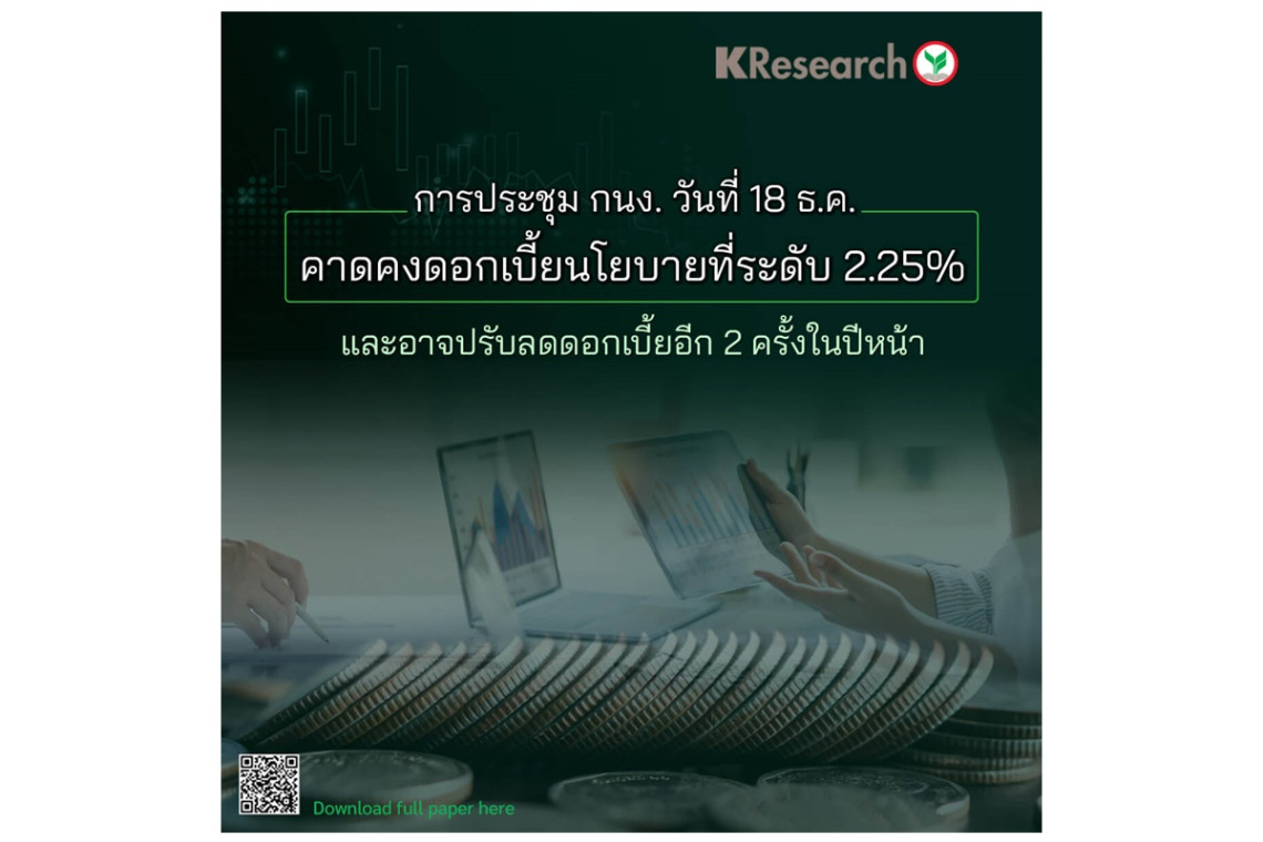 "ศูนย์วิจัยกสิกร" คาด กนง.นัดส่งท้ายปีคงดอกเบี้ยนโยบายที่ 2.25% ส่วนปีหน้าลด 2 ครั้ง
