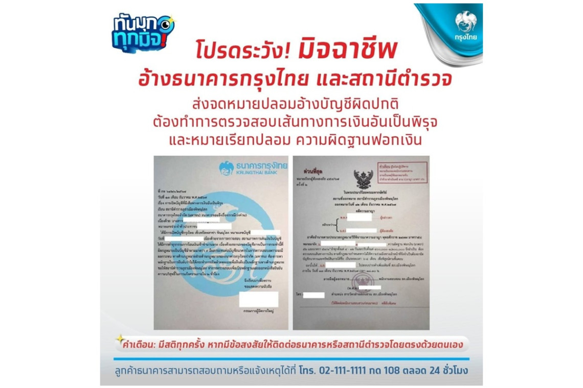 เตือนมิจฉาชีพ! ส่งจดหมายปลอมอ้างธนาคารกรุงไทย-สถานีตำรวจ ขอตรวจเส้นทางการเงิน อย่าหลงเชื่อ