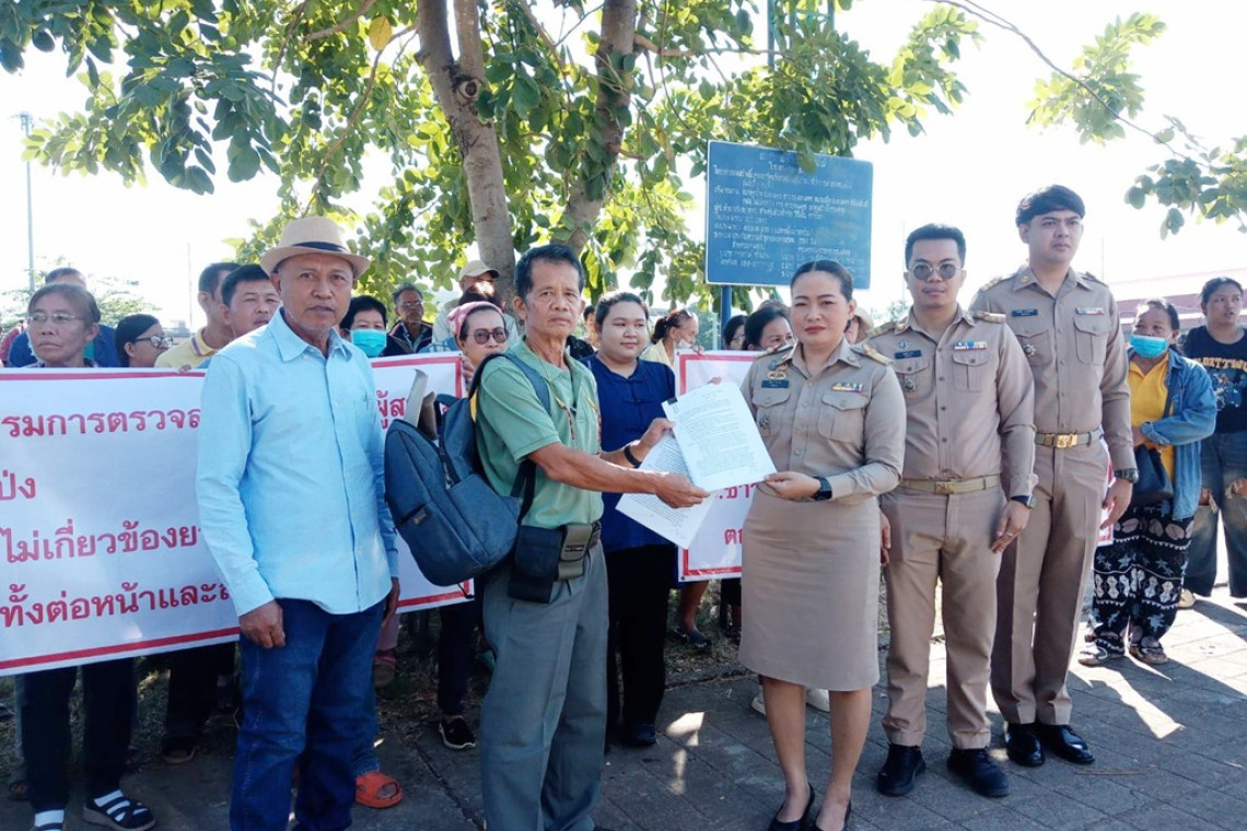 ชาวบ้านห้วยโป่ง ถือป้ายประท้วงคัดค้าน ผู้สมัคร ผญบ.รายหนึ่งพัวพันคดียาเสพติด พร้อมยื่นหนังสือมอบเอกสารหลักฐาน หลังคณะกรรมการตรวจสอบคุณสมบัติ มีมติ 7-0 มีคุณสมบัติต้องห้ามตามพระราชบัญญัติลักษณะปกครองท้องที่ พ.ศ.2457 มาตรา 12(8)