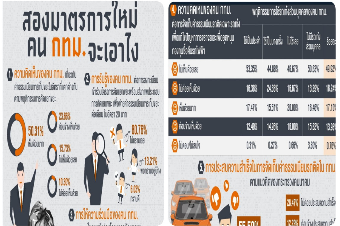 จากการสำรวจเมื่อถามความคิดเห็นของคนกรุงเทพมหานครเกี่ยวกับค่าธรรมเนียมการเก็บขยะในอัตราที่แตกต่างกัน ตามพฤติกรรมการคัดแยกขยะ พบว่า ตัวอย่าง ร้อยละ 50.31 ระบุว่า เห็นด้วยมาก รองลงมา ร้อยละ 23.66 ระบุว่า ค่อนข้างเห็นด้วย ร้อยละ 15.73 ระบุว่า ไม่เห็นด้วยเลย และร้อยละ 10.30 ระบุว่า ไม่ค่อยเห็นด้วย