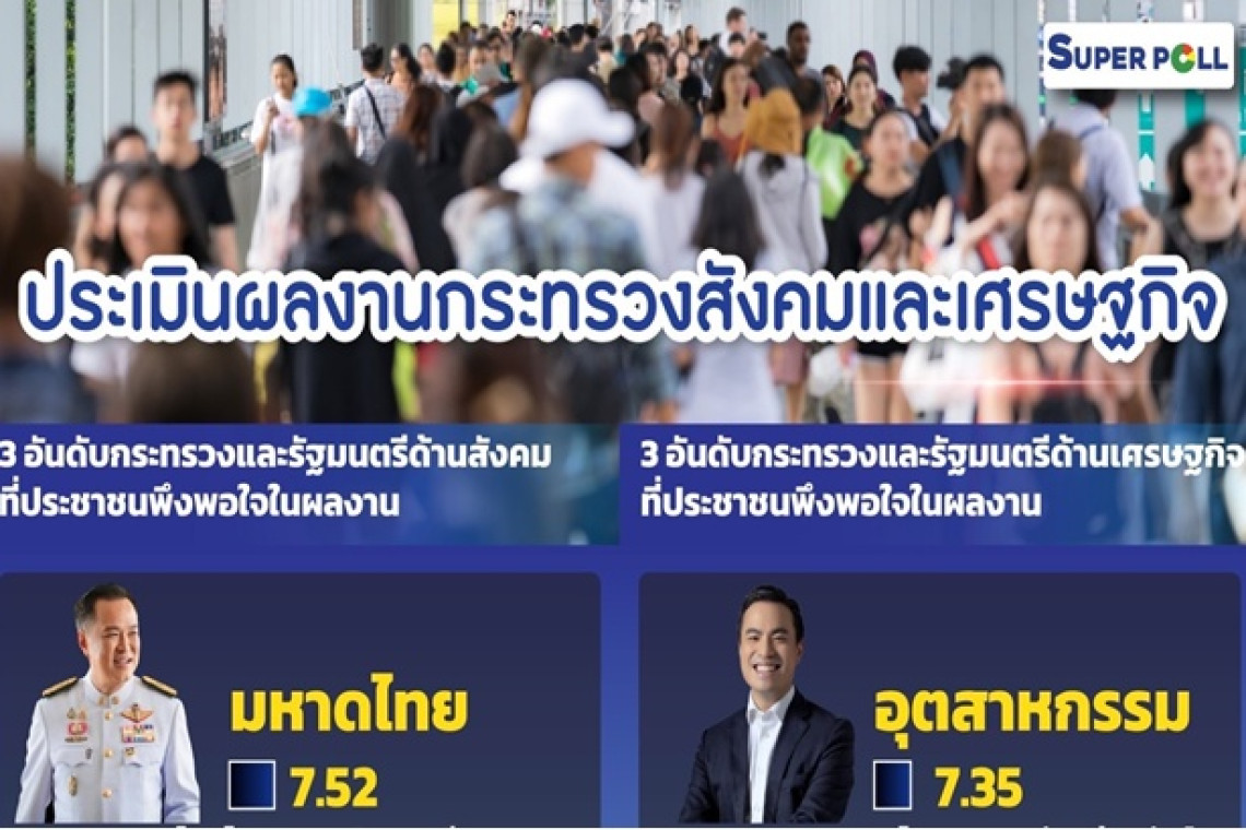 เมื่อสอบถามถึงกระทรวงด้านเศรษฐกิจ ขับเคลื่อนเศรษฐกิจของประเทศ ที่ประชาชนพึงพอใจ3 อันดับแรก ได้แก่ กระทรวงอุตสาหกรรม โดย นายเอกนัฏ พร้อมพันธุ์ รัฐมนตรีว่าการกระทรวงอุตสาหกรรมได้คะแนนสูงสุดอันดับ 1 เมื่อคะแนนเต็ม 10 คะแนน ได้ 7.35 คะแนน โดยมีผลงานการขยายตัวของอุตสาหกรรมรถยนต์ไฟฟ้า การพัฒนาการนิคมอุตสาหกรรม ทำคนไทยมีอาชีพในนิคมพื้นที่ต่าง ๆ อุตสาหกรรมรถยนต์ อิเล็กทรอนิกส์ พลังงานทดแทนเป็นมิตรสิ่งแวดล้อม อุตสาหกรรมสีเขียว การแก้ปัญหากากสารพิษจากโรงงานอุตสาหกรรม การใช้เทคโนโลยีปัญญาประดิษฐ์ พัฒนาอาชีพคนไทยในนิคมอุตสาหกรรม การสนับสนุนธุรกิจ SME และการขับเคลื่อนเศรษฐกิจอุตสาหกรรมส่งออกสินค้าไทย เป็นต้น