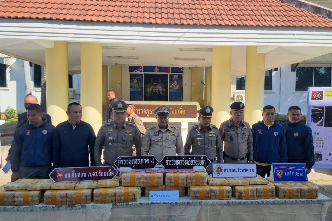ศอ.ปส.จ.รอ.ร่วมตำรวจภูธรจังหวัดร้อยเอ็ดแถลงข่าวการจับกุมเครือข่ายผู้ต้องหาคดียาเสพติดพร้อมของกลางยาบ้า1ล้านเม็ด
