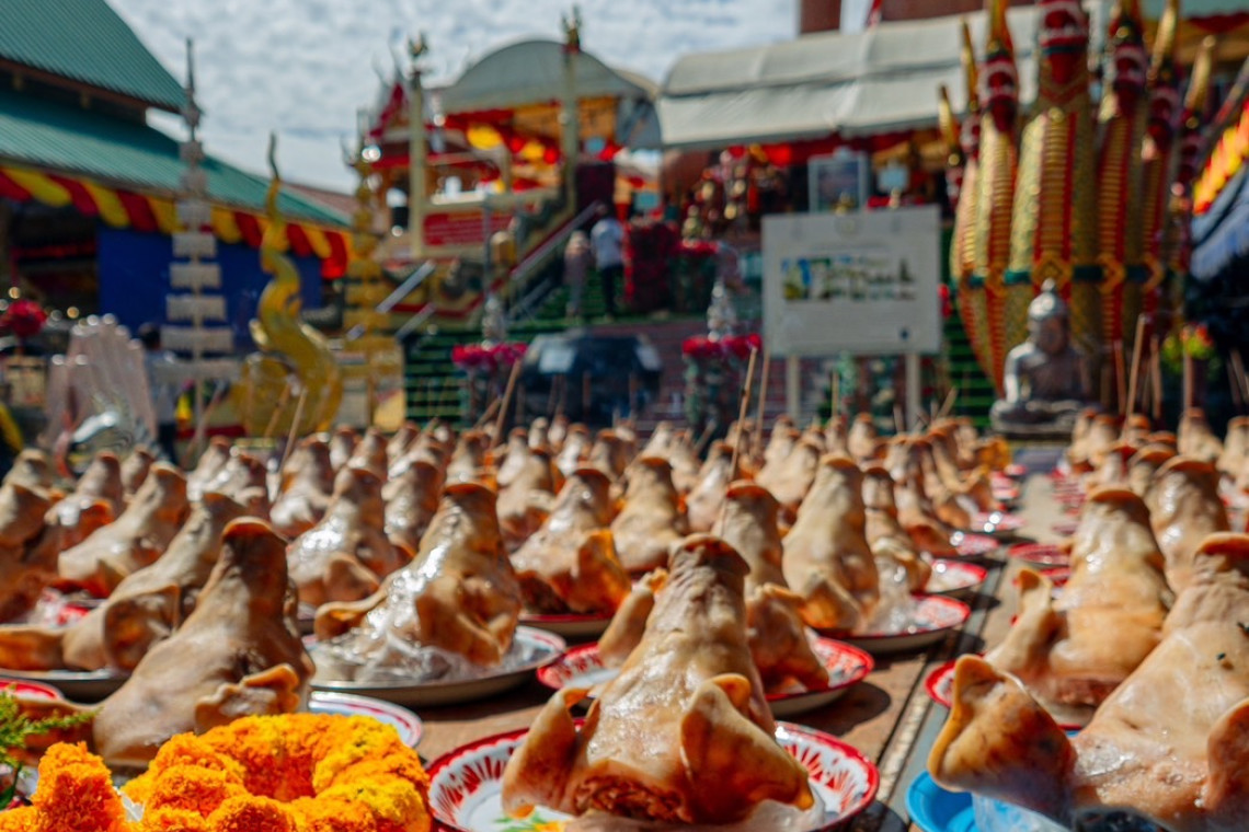 นครปฐม แม่ค้าขายหมูนครนายก นำหัวหมู 100 หัว แก้บนหลวงพ่อสมหวัง หลังสู้มา 3-4 ปี จนชนะได้ที่ดินคืนมา30กว่าไร่