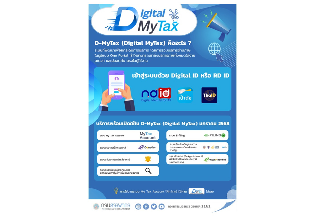 เมื่อวันที่ 1 ม.ค.68 นายปิ่นสาย สุรัสวดี อธิบดีกรมสรรพากร เปิดเผยว่า ระบบ D-MyTax (Digital MyTax) ช่วยให้ผู้เสียภาษีสามารถยืนยันตัวตนเพียงครั้งเดียว ไม่ต้องยืนยันตัวตนซ้ำในแต่ละบริการ โดยสามารถเข้าสู่ระบบ D-MyTax (Digital MyTax) ได้ผ่านทางเว็บไซต์กรมสรรพากร www.rd.go.th โดยใช้ Digital ID หรือ RD ID ในการล็อกอิน ซึ่งระบบจะแยกบริการออกเป็นหลายประเภทตามกลุ่มผู้เสียภาษี เช่น บุคคลธรรมดา นิติบุคคล และผู้ที่จดทะเบียนภาษีมูลค่าเพิ่มทั้งในรูปแบบบุคคลธรรมดาและนิติบุคคล สำหรับในระยะแรก เดือนมกราคม 2568 มีบริการที่พร้อมใช้งานเช่น ระบบ My Tax Account ที่ช่วยอำนวยความสะดวกผู้เสียภาษีในการจัดเตรียมข้อมูลการยื่นแบบฯ ระบบ e-filing สำหรับการยื่นแบบภาษีออนไลน์ ระบบบริจาคอิเล็กทรอนิกส์ (e-Donation) ที่อำนวยความสะดวกในการติดตามข้อมูลการบริจาค ระบบนัดหมาย(E-Appointment) เพื่อให้คำปรึกษาประเด็นภาษีระหว่างประเทศ นอกจากนี้ยังมีระบบที่เชื่อมโยงข้อมูลระหว่างกรมสรรพากรและหน่วยงานภาครัฐ เพื่อสนับสนุนการให้บริการที่ไร้รอยต่อ