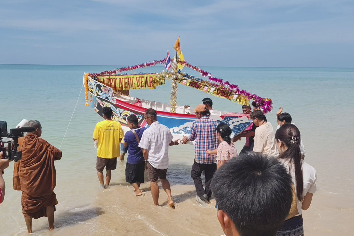 โดยได้นิมนต์พระอาจารย์ขจร อภินันโท หัวหน้าที่พักสงฆ์บ่อหินแร่ ต.บางม่วง อ.ตะกั่วป่า จ.พังงา ซึ่งเป็นพระนักเทศน์ที่มีชื่อเสียง พร้อมพระภิกษุจำนวน 5 รูป ร่วมสวดมนต์เพื่อปัดเป่าสิ่งชั่วร้ายให้ออกไปจากครอบครัวและหมู่บ้าน โดยจะนำข้าวสาร อาหารแห้ง ดอกไม้ ธูปเทียน เศษเล็บ เศษผม และเศษผ้านุ่งห่มใส่ลงไปในเรือ ก่อนนำไปปล่อยลอยสู่ทะเลชายทะเลหาดบางสัก