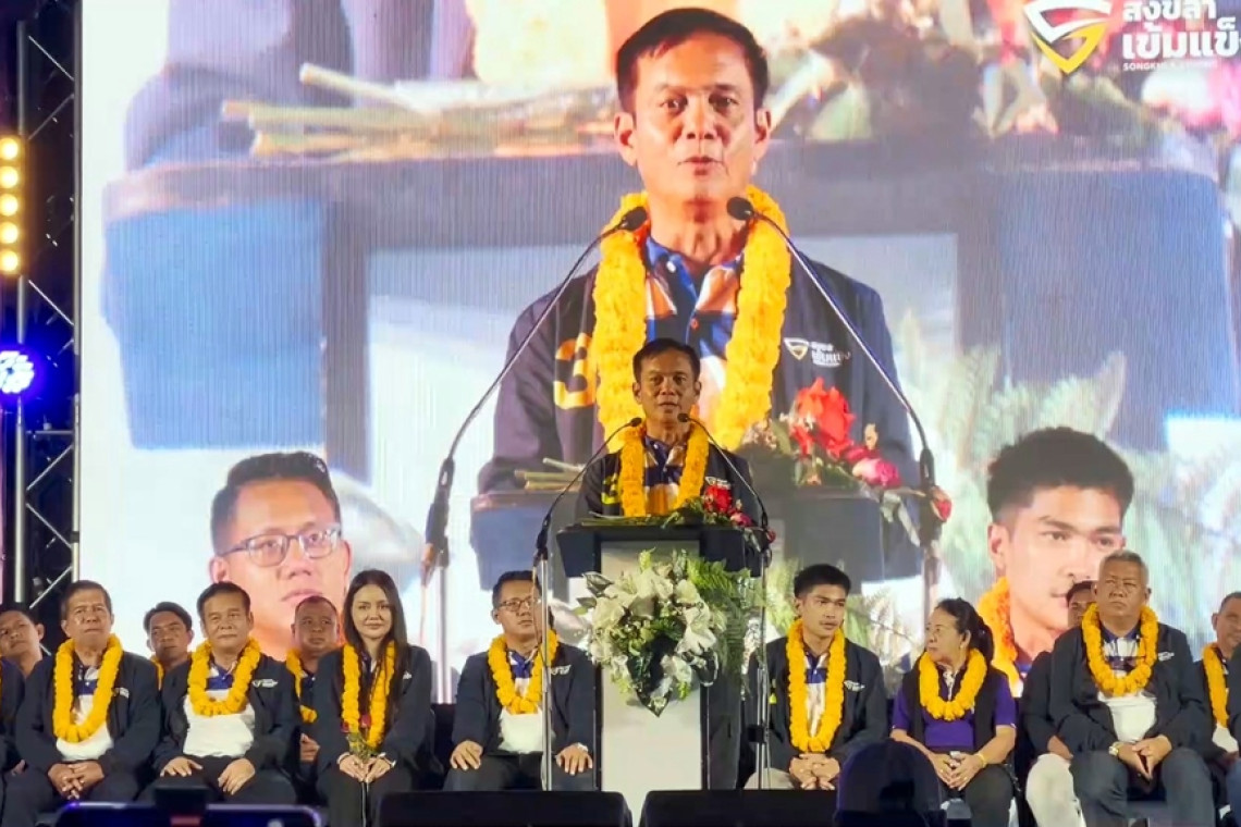 วันที่ 6 ม.ค.67 ที่หน้าสถานีรถไฟหาดใหญ่ จ.สงชลา บรรยากาศการเปิดเวทีปราศรัยเวทีแรกจากบรรดาผู้สมัครนายกอบจ.สงขลาทั้ง 9 คน โดยเวทีนี้เป็นเวทีแรกของผู้สมัครนายก อบจ.เบอร์ 3 นายประสงค์ บริรักษ์ ทีมสงขลาเข้มแข็ง ดึงนายกน้ำ วารินทร์ ชินวงศ์ นายก อบจ.นครศรีธรรมราช ผู้สร้างประวัติศาสตร์ล้มบ้านใหญ่ไม่ซื้อเสียงมาสร้างกระแสตอกย้ำอีกครั้งในการเลือกตั้งของสงขลาในครั้งนี้ ท่ามกลางมวลชนนับพันแห่ให้กำลังใจ