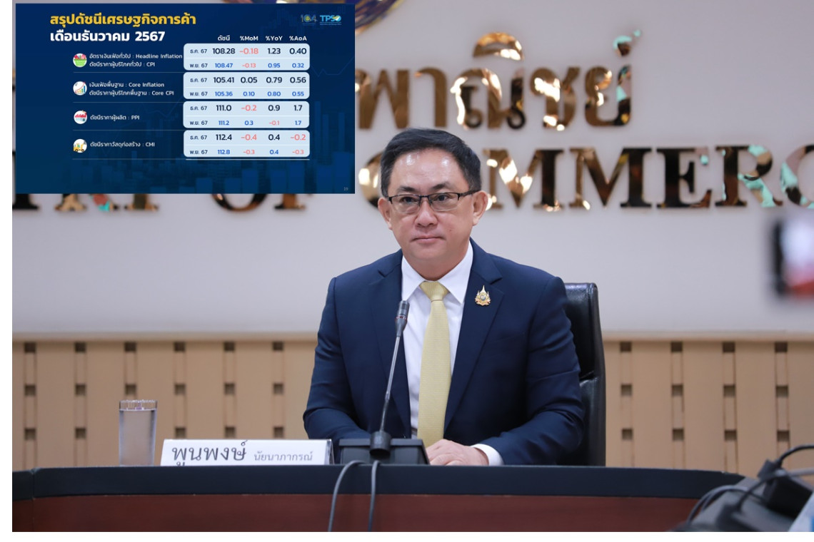พาณิชย์เปิดตัวเลขเงินเฟ้อ ธ.ค.โต 1.23% ทั้งปีเฉลี่ย 0.40% คาดปี 68 ขยายตัวในช่วง 0.3-1.3%