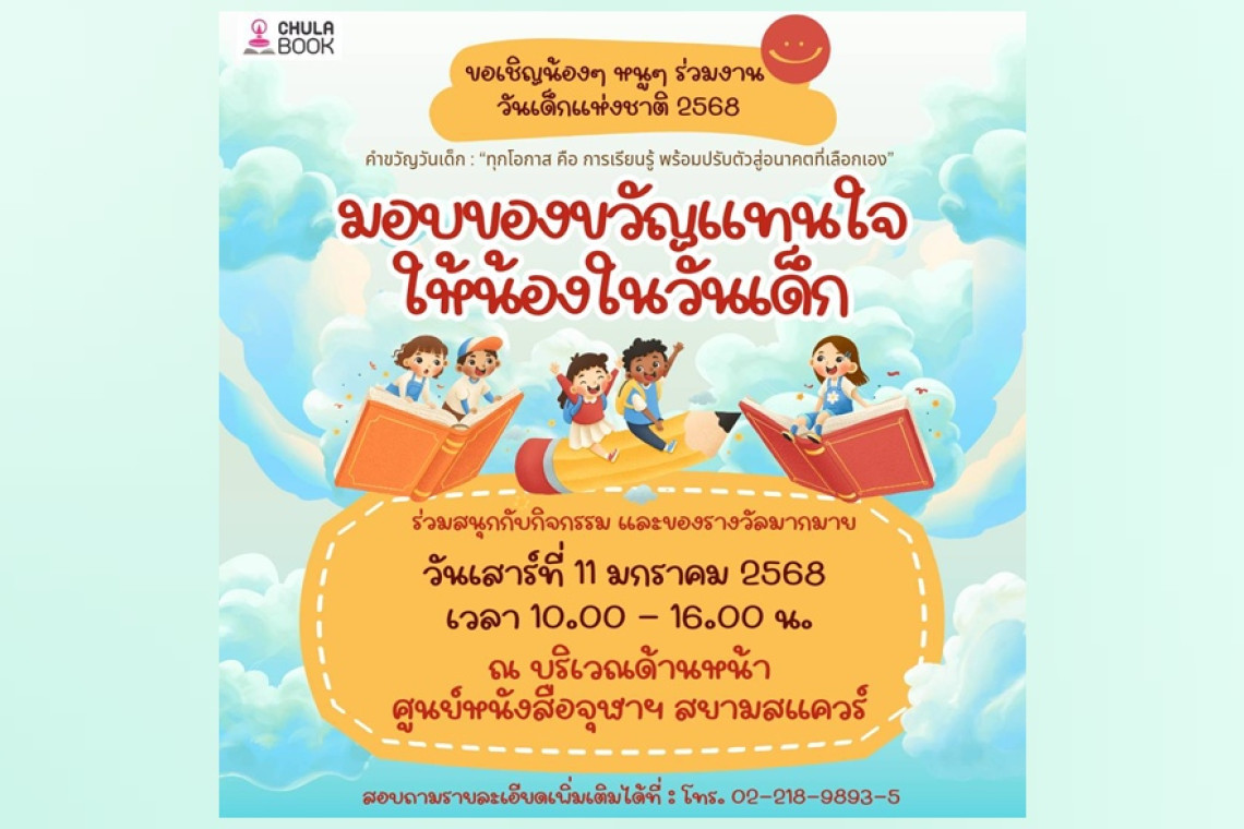 ในโอกาสวันเด็กแห่งชาติ 2568 ศูนย์หนังสือจุฬาลงกรณ์มหาวิทยาลัย ขอเชิญคุณหนูๆ ร่วมงาน “มอบของขวัญแทนใจ ให้น้องในวันเด็ก” ในวันเสาร์ที่ 11 มกราคม 2568 เวลา 10.00 – 16.00 น. ณ บริเวณโถงด้านหน้า ศูนย์หนังสือจุฬาฯ สาขาสยามสแควร์ อาคารวิทยกิตติ์ ชั้น G เพื่อเปิดโอกาสให้เด็กได้แสดงออก และสนุกสนานไปกับกิจกรรมต่างๆ พร้อมของแจก ของรางวัลมากมาย