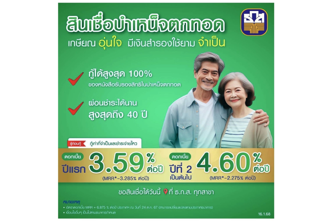 ธ.ก.ส.เสิร์ฟสินเชื่อบำเหน็จตกทอด สำหรับผู้เกษียณอายุที่ได้รับเงินบำนาญและบำเหน็จรายเดือน นำไปใช้เป็นค่าใช้จ่ายหมุนเวียนในชีวิตประจำวันและค่าใช้จ่ายอื่น ๆ ที่จำเป็น รวมถึงการลดปัญหาการพึ่งพาหนี้นอกระบบที่มีอัตราดอกเบี้ยไม่เป็นธรรม เพื่อคุณภาพชีวิตที่ดี วงเงินกู้ต่อรายสูงสุด 100% ของหนังสือรับรองสิทธิในบำเหน็จตกทอด อัตราดอกเบี้ยปีแรก MRR ลบ 3.285% ต่อปี ปัจจุบันเท่ากับ 3.59% เท่านั้น และปีที่ 2 เป็นต้นไป MRR ลบ 2.275% ต่อปี ผ่อนชำระสูงสุด 40 ปี แจ้งความประสงค์ได้แล้วที่ ธ.ก.ส.ทุกสาขา ตั้งแต่วันนี้เป็นต้นไป