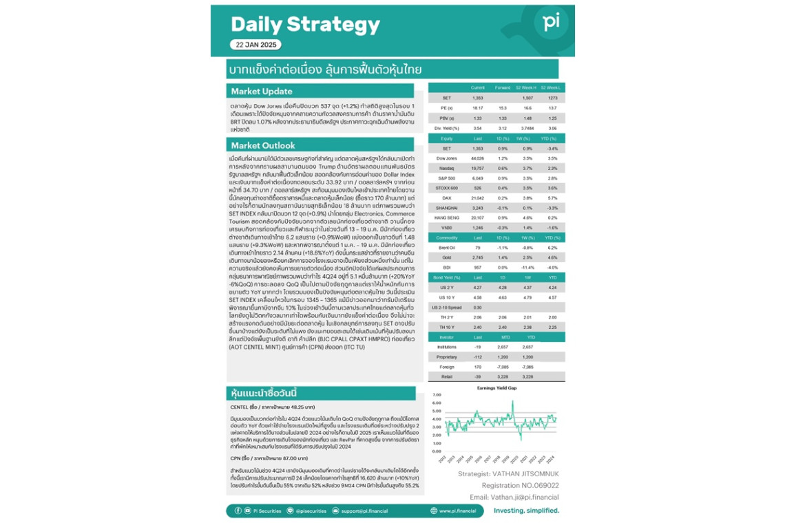 เมื่อคืนที่ผ่านมามิได้มีตัวเลขเศรษฐกิจที่สำคัญ แต่ตลาดหุ้นสหรัฐฯได้กลับมาเปิดทำการหลังจากทราบผลสาบานตนของ Trump ด้านอัตราผลตอบแทนพันธบัตรรัฐบาลสหรัฐฯกลับมาฟื้นตัวเล็กน้อย สอดคล้องกับการอ่อนค่าของ Dollar Index และเงินบาทแข็งค่าต่อเนื่องทดสอบระดับ 33.92 บาท / ดอลลาร์สหรัฯ จากก่อนหน้าที่ 34.70 บาท / ดอลลาร์สหรัฐฯ สะท้อนมุมมองเงินไหลเข้าประเทศไทยโดยวานนี้นักลงทุนต่างชาติซื้อตราสารหนี้และตลาดหุ้นเล็กน้อย (ซื้อราว 170 ล้านบาท) แต่อย่างไรก็ตามนักลงทุนสถาบันขายสุทธิเล็กน้อย 18 ล้านบาท แต่ภาพรวมพบว่า SET INDEX กลับมาปิดบวก 12 จุด (+0.9%) นำโดยกลุ่ม Electronics , Commerce , Tourism สอดคล้องกับปัจจัยบวกจากตัวเลขนักท่องเที่ยวต่างชาติ วานนี้กองเศรษบกิจการท่องเที่ยวและกีฬาระบุว่าในช่วงวันที่ 13 – 19 ม.ค. มีนักท่องเที่ยวต่างชาติเดินทางเข้าไทย 8.2 แสนราย (+0.9%WoW) แบ่งออกเป็นชาวจีนที่ 1.48 แสนราย (+9.3%WoW) และหากพิจารณาตั้งแต่ 1 ม.ค. – 19 ม.ค. มีนักท่องเที่ยวเดินทางเข้าไทยราว 2.14 ล้านคน (+18.6%YoY) ดังนั้นกระแสข่าวที่รายงานว่าคนจีนเดินทางมาน้อยลงหรือยกเลิกการจองโรงแรมอาจเป็นเพียงส่วนหนึ่งเท่านั้น แต่ในความจริงแล้วยังคงเห็นการขยายตัวต่อเนื่อง ส่วนอีกปัจจัยได้แก่ผลประกอบการกลุ่มธนาคารพาณิชย์ภาพรวมพบว่ากำไร 4Q24 อยู่ที่ 5.1 หมื่นล้านบาท (+20%YoY -6%QoQ) การชะลอลง QoQ เป็นไปตามปัจจัยฤดูกาลแต่เราให้น้ำหนักกับการขยายตัว YoY มากกว่า โดยรวมมองเป็นปัจจัยหนุนต่อตลาดหุ้นไทย วันนี้ประเมิน SET INDEX เคลื่อนไหวในกรอบ 1345 – 1365 แม้มีข่าวออกมาว่าทรัมป์เตรียมพิจารณาขึ้นภาษีจากจีน 10% ในช่วงเช้าวันนี้ตามเวลาประเทศไทยแต่ตลาดหุ้นทั่วโลกยังดูไม่วิตกกังวลมากเท่าใดพร้อมกับเงินบาทยังแข็งค่าต่อเนื่อง จึงไม่น่าจะสร้างแรงกดดันอย่างมีนัยยะต่อตลาดหุ้น ในเชิงกลยุทธ์การลงทุน SET อาจปรับขึ้นมาบ้างแต่ยังเป็นระดับที่ไม่แพง ยังแนะทยอยสะสมได้เช่นเดิมเน้นที่หุ้นปรับลงมาลึกแต่ปัจจัยพื้นฐานยังดี อาทิ ค้าปลีก (BJC CPALL CPAXT HMPRO) ท่องเที่ยว (AOT CENTEL MINT) ศูนย์การค้า (CPN) ส่งออก (ITC TU)