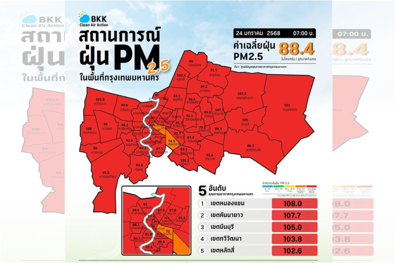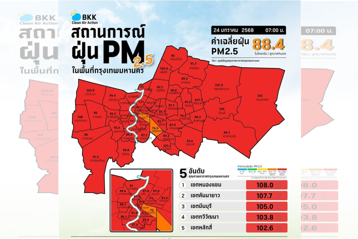 วันที่ 24 ม.ค.68 ศูนย์ข้อมูลคุณภาพอากาศกรุงเทพมหานครรายงานสถานการณ์ฝุ่น PM 2.5 วันที่ 24 มกราคม 2568 เวลา 07.00 น. ค่าเฉลี่ยของกรุงเทพมหานคร 88.4 มคก./ลบ.ม. ค่า PM2.5 มีแนวโน้มเพิ่มขึ้น เกินมาตรฐานอยู่ในระดับสีส้ม เริ่มมีผลกระทบต่อสุขภาพ จำนวน 3 พื้นที่ ระดับสีแดง มีผลกระทบกับสุขภาพ 67 พื้นที่