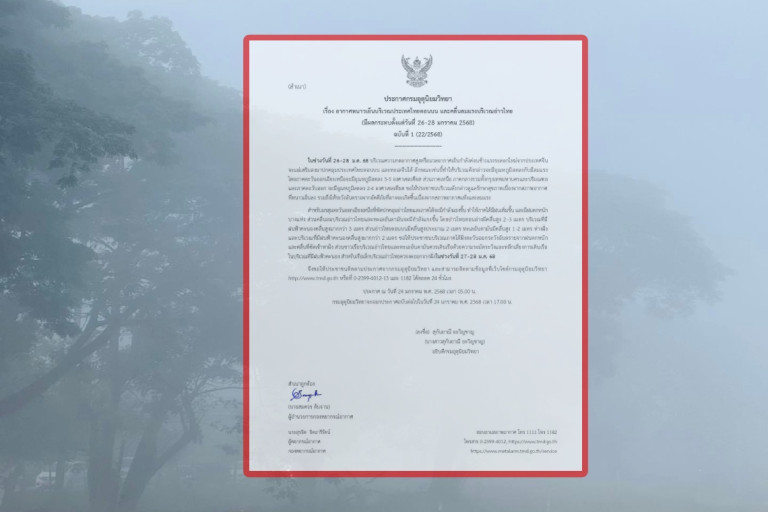 วันที่ 24 ม.ค.68 นางสาวสุกันยาณี ยะวิญชาญ อธิบดีกรมอุตุนิยมวิทยา ออกประกาศกรมอุตุนิยมวิทยา เรื่อง อากาศหนาวเย็นบริเวณประเทศไทยตอนบน และคลื่นลมแรงบริเวณอ่าวไทย (มีผลกระทบตั้งแต่วันที่ 26-28 มกราคม 2568) ฉบับที่ 1 (22/2568)