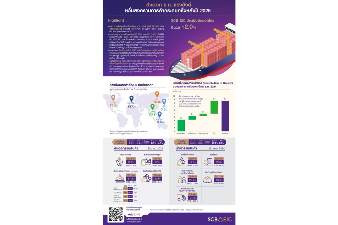 ทั้งนี้ SCB EIC ประเมินมุมมองการส่งออกไทยปี 2025 (ณ พ.ย. 2024) ที่ 2% (ข้อมูลระบบดุลการชำระเงิน) โดย SCB EIC อยู่ระหว่างการประเมินแนวโน้มการส่งออกไทยในปี 2025 ใหม่และเผยแพร่ในเดือน ก.พ.