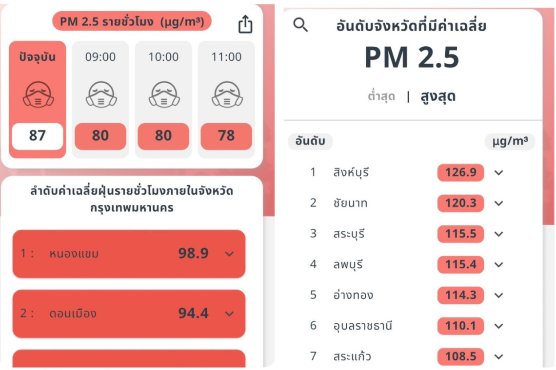 ด้านของภาพรวมประเทศไทยในรอบเวลาเดียวกัน พบค่าฝุ่น PM2.5 ที่ส่งผลกระทบต่อสุขภาพและระบบทางเดินหายใจในระดับสีแดงกว่า 47 จังหวัด ซึ่งกระจายอยู่ในทั่วทุกภูมิภาค และพบค่า PM2.5 เริ่มมีผลกระทบต่อสุขภาพในระดับสีส้ม กระจายอยู่ในหลายพื้นที่