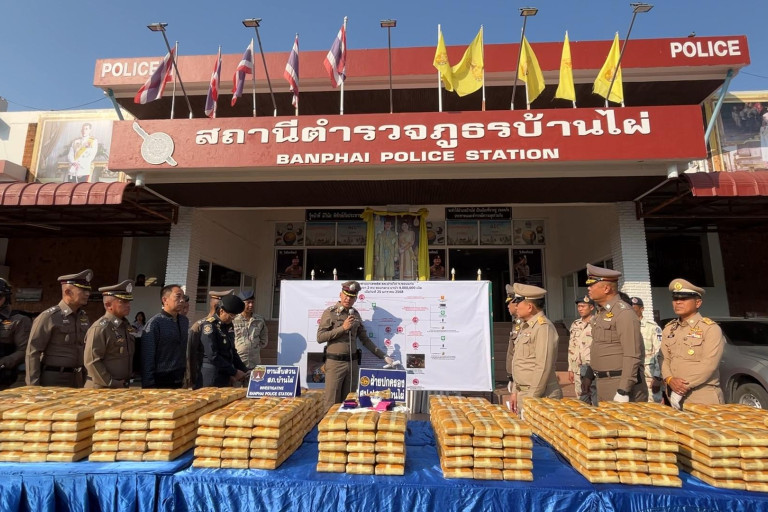 พล.ต.ท.ฉัตรชัย สุรเชษฐพงษ์ ผบช.ภ.4 กล่าวว่า เจ้าหน้าที่ตำรวจชุดสืบสวน สภ.บ้านไผ่ สืบทราบว่า จะมีขบวนการค้ายาเสพติด ลักลอบขนยาเสพติดมาจากจังหวัดนครพนม และจะทำการขนส่งต่อให้เครือข่ายที่ถนนทางเข้าบ้านสว่าง ต.หินตั้ง อ.บ้านไผ่ จ.ขอนแก่น เจ้าหน้าที่จึงนำกำลังดักซุมในบริเวณดังกล่าว กระทั่งพบชาย 2 คน ลงจากรถแล้วขนกระสอบสีดำลงจากรถด้วย จึงทำการเข้าจับกุมผู้ต้องหาทั้ง 2 คนพร้อมยาบ้า จำนวนดังกล่าว