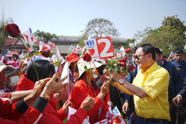 จากนั้น นายทักษิณ ปราศรัยว่า สุมาเต๊อะมาช้าไปหน่อย อากาศฮ้อนยังอุตส่าห์รอ ขอบคุณจั๊ดนัก ดีใจที่ได้มาเจอกัน วันนี้ดีใจที่ได้มาพบพี่น้อง ดีใจที่พี่น้องอุตส่าห์รอในเวลาเที่ยงแล้ว ตนหายไป 17 ปี พี่น้องคิดถึงผมหรือไม่ หายไป 17 ปี คิดว่ามีตึกระฟ้าเยอะแล้ว แต่กลับมาก็เหมือนเก่า ดังนั้น ตนจะกลับมาช่วยพัฒนาเชียงรายให้เจริญ 10 กว่าปีที่ผ่านมา มีเงินอยู่หรือไม่ ล้วงกระเป๋ามีเงินหรือไม่ หรือมีอยู่นิดเดียว ปีนี้จะค่อยๆ มี ปีหน้าจะมีเยอะขึ้น เราจะช่วยกัน รัฐบาลจะสร้างโอกาสเต็มที่ วันนี้หลายคนอาจจะคิดว่าทักษิณจะเอาอย่างไรกับเรื่อง อบจ. ที่ผ่านมาไม่เคยสนใจเรื่องท้องถิ่น วันนี้บ้านเราฐานรากกำลังสึกหรอ ตอนนี้ฐานรากเสาเข็มพังหมดแล้ว ซ่อมยาก ต้องใช้แนวร่วมช่วยกันฟื้นเศรษฐกิจ