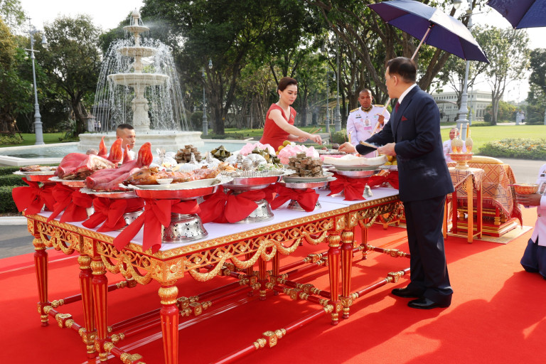 พระบรมราชินี เสด็จลง ณ บริเวณด้านหน้าพระที่นั่งอัมพรสถาน พระราชวังดุสิต ทรงประกอบพระราชพิธีสังเวยพระป้าย เนื่องในเทศกาลตรุษจีน พุทธศักราช ๒๕๖๘