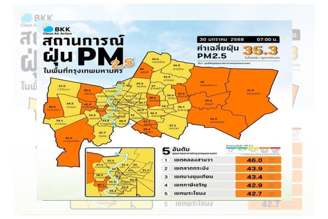วันที่ 30 ม.ค.68 ศูนย์ข้อมูลคุณภาพอากาศกรุงเทพมหานครรายงานสถานการณ์ฝุ่น PM 2.5 วันที่ 30 มกราคม พ.ศ. 2568 เวลา 07.00 น.