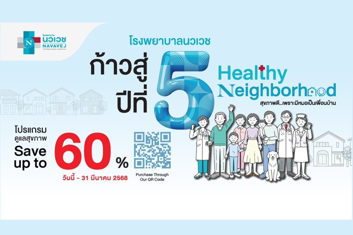 “โรงพยาบาลนวเวช” โรงพยาบาลย่านเกษตร-นวมินทร์ ที่พร้อมดูแลสุขภาพของทุกคนด้วยความเข้าใจ ครอบคลุมทุกช่วงวัย ผ่านทีมแพทย์ผู้ชำนาญการและศูนย์แพทย์เฉพาะทาง 21 ศูนย์ จัดแคมเปญก้าวเข้าสู่ปีที่ 5 Healthy Neighborhood สุขภาพดี…เพราะมีหมอเป็นเพื่อนบ้าน ร่วมฉลองกับโปรแกรมดูแลสุขภาพ Healthy Celebration Package สำหรับผู้ที่ต้องการตรวจสุขภาพ เพื่อทราบความแข็งแรงของร่างกาย รวมทั้งค้นหาความผิดปกติในการทำงานของระบบต่าง ๆ แบบเฉพาะเจาะจง อาทิ โปรแกรมพื้นฐานทั่วไป Standard (16 รายการ), โปรแกรม Silver อายุ 20 - 35 ปี (21 รายการ) โปรแกรม Platinum เพศหญิง อายุ 35 ปีขึ้นไป (36 รายการ), โปรแกรม Diamond เพศชาย อายุ 40 ปีขึ้นไป (44 รายการ) เป็นต้น โดยมอบส่วนลดสูงสุดกว่า 60% ราคาเริ่มต้น 2,300 บาท เพื่อสุขภาพดีแบบยั่งยืน พร้อมที่จะดูแลสุขภาพทุกช่วงชีวิตของคุณให้คุณมีความสุขกับคนที่คุณรัก
