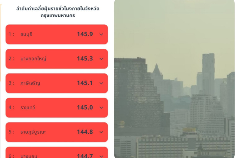กระทรวง อว. โดย GISTDA เกาะติดสถานการณ์ฝุ่น PM 2.5 ด้วยข้อมูลจากดาวเทียมแบบรายชั่วโมงผ่านแอปพลิเคชัน “เช็คฝุ่น” รอบเวลา 07.00 น. ของวันที่ 31 มกราคม 2568 พบทุกเขตของกรุงเทพมหานครมีค่าฝุ่น PM2.5 มีผลกระทบต่อสุขภาพ และระบบทางเดินหายใจในระดับแดง เกินกว่า 100 ไมโครกรัม โดยค่าฝุ่น PM 2.5 สูงสุด คือเขต #ธนบุรี 145.9 ไมโครกรัม