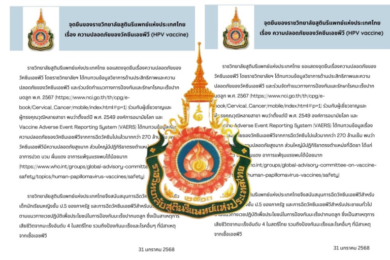 ราชวิทยาลัยสูตินรีแพทย์แห่งประเทศไทย ขอแสดงจุดยืนเรื่องความปลอดภัยของวัคซีนเอชพีวี โดยราชวิทยาลัยฯ ได้ทบทวนข้อมูลวิชาการด้านประสิทธิภาพและความ