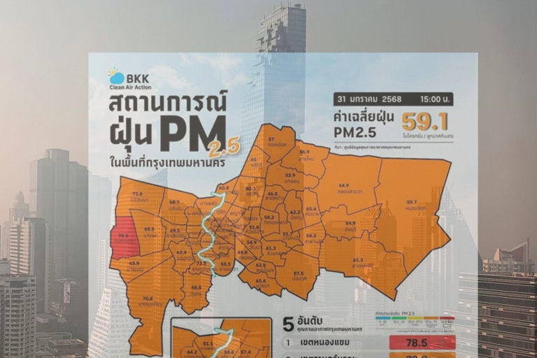วันที่ 31 มกราคม 2568 เวลา 15:00 น.ศูนย์ข้อมูลคุณภาพอากาศกรุงเทพมหานคร ขอรายงานสถานการณ์ฝุ่นละอองขนาดไม่เกิน 2.5 ไมครอน (PM 2.5) ในกรุงเทพมหานคร ค่าเฉลี่ยของกรุงเทพมหานคร 59.1 ไมโครกรัมต่อลูกบาศก์เมตร (มคก./ลบ.ม.)