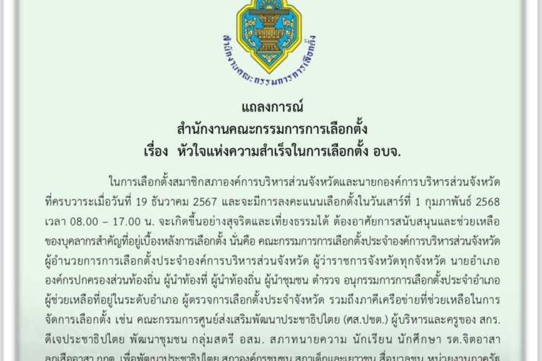 สำนักงาน กกต. ออกแถลงการณ์หัวใจแห่งความสำเร็จในการเลือกตั้ง อบจ.   ขอบคุณจนท. และบุคลากรทุกภาคส่วน  เป็นหัวใจความสำเร็จเลือกตั้ง อบจ.พรุ่งนี้   หวังผลสุจริต เที่ยงธรรม ชอบด้วยกฎหมาย