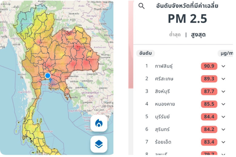 ด้านของภาพรวมประเทศไทยในรอบเวลาเดียวกัน พบค่าฝุ่น PM2.5 ส่งผลกระทบต่อสุขภาพและระบบทางเดินหายใจในระดับสีแดง 20 จังหวัด และพบค่าฝุ่น PM2.5 ที่เริ่มมีผลต่อสุขภาพ กระจายอยู่ในหลายพื้นที่ของประเทศ