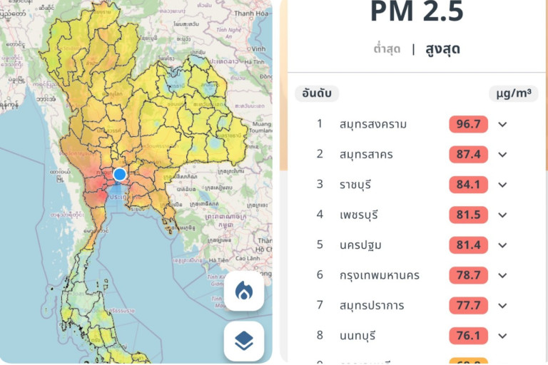ด้านของภาพรวมประเทศไทยในรอบเวลาเดียวกัน พบค่าฝุ่น PM2.5 ที่มีผลกระทบต่อสุขภาพและระบบทางเดินหายใจในระดับสีแดง 8 จังหวัด ส่วนใหญ่อยู่ในพื้นที่ภาคกลาง และพบ PM2.5 ที่เริ่มมีผลต่อสุขภาพ กระจายอยู่ในหลายพื้นที่ของประเทศ