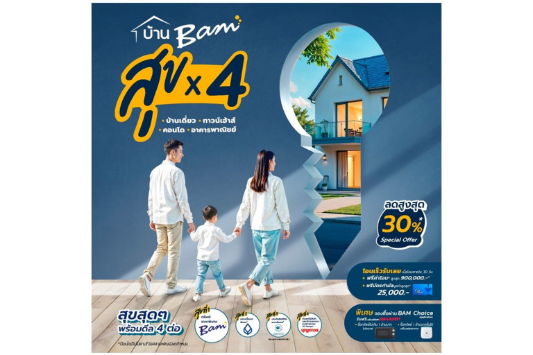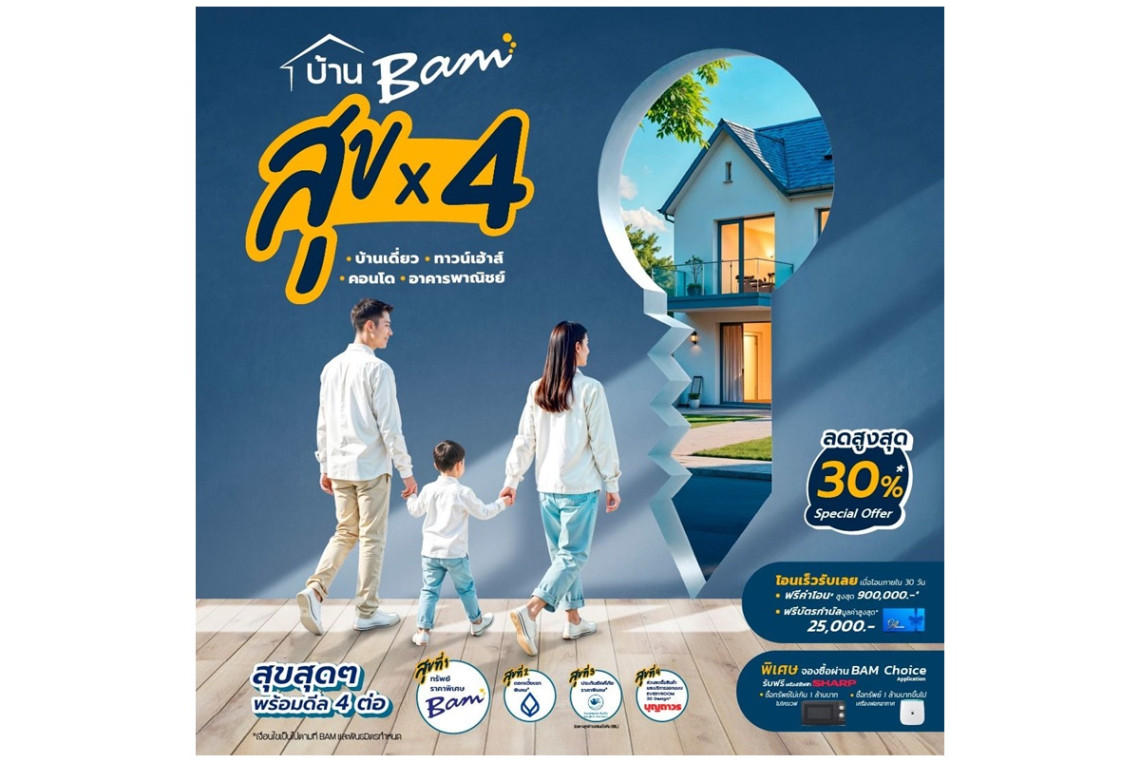 เมื่อวันที่ 5 ก.พ.68 นายบรรยง วิเศษมงคลชัย รองประธานกรรมการ และรักษาการประธานเจ้าหน้าที่บริหาร บริษัทบริหารสินทรัพย์ กรุงเทพพาณิชย์ จำกัด (มหาชน) หรือ BAM กล่าวว่า BAM ได้ผนึกกำลังพันธมิตรจัดแคมเปญ “ บ้าน BAM สุข x 4 ” ตั้งแต่วันนี้ถึงวันที่ 15 มีนาคม 2568 ให้กับลูกค้าที่ซื้อทรัพย์ BAM ได้แก่ สุขที่ 1 ทรัพย์ BAM ราคาพิเศษลดสูงสุด 30% สุขที่ 2 ดอกเบี้ยพิเศษจากธนาคารกรุงเทพ (BBL) สุขที่ 3 เบี้ยประกันอัคคีภัยราคาพิเศษจากกรุงเทพประกันภัย (BKI) (เฉพาะลูกค้าที่ขอสินเชื่อกับธนาคารกรุงเทพ) สุขที่ 4 ส่วนลดซื้อสินค้า และบริการออกแบบ Everyroom 3D Design จากบุญถาวร โดยคัดทรัพย์ที่อยู่อาศัยสภาพดี 3 ดาวขึ้นไป ทั้งบ้านเดี่ยว ทาวน์เฮ้าส์ คอนโดมิเนียม อาคารพาณิชย์ จำนวนกว่า 2,300 รายการ มูลค่ารวมกว่า 5,200 ล้านบาท มาให้ลูกค้าเลือกช็อป นอกจากนี้เมื่อซื้อทรัพย์ในแคมเปญทุกรายการ และโอนกรรมสิทธิ์ภายใน 30 วัน รับโปร “โอนเร็ว รับเลย” ฟรีค่าโอนสูงสุด 900,000 บาท ต่อรายการทรัพย์ รับบัตรกำนัลมูลค่าสูงสุด 25,000 บาท พิเศษสุด เมื่อจองซื้อทรัพย์ ผ่านช่องทาง BAM Choice Application และซื้อทรัพย์ไม่เกิน 1 ล้านบาท รับไมโครเวฟ SHARP หรือซื้อทรัพย์เกิน 1 ล้านบาท รับเครื่องฟอกอากาศ SHARP ทั้งนี้ BAM คัดทรัพย์นำมาจัดแคมเปญหลากหลายทำเล เช่น