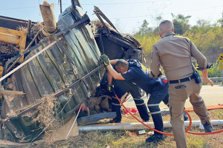 จันทบุรี รถพ่วงคอนเทนเนอร์ห้องเย็น 22 ล้อ บรรทุกลำไย ขับลงเขาเสียหลักแหกโค้งพลิกคว่ำ ทับคนขับเจ็บติดภายใน รองผู้การฯจันท์ ผ่านประสบเหตุ โดดช่วยกู้ภัยฯ งัดซากช่วยชีวิต
