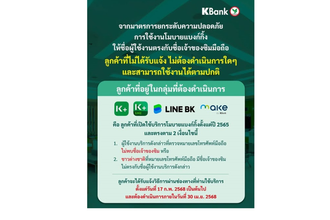 ลูกค้าที่อยู่ในกลุ่มที่ต้องดำเนินการที่ใช้บริการ K PLUS / K PLUS SME/ LINE BK / MAKE by KBank จะได้รับแจ้งวิธีการผ่านช่องทางที่ท่านใช้บริการตั้งแต่วันที่ 17 กุมภาพันธ์ เป็นต้นไปและต้องดำเนินการภายในวันที่ 30 เม.ย. 2568