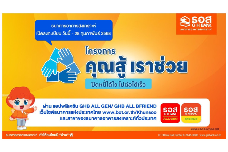 เมื่อวันที่ 10 ก.พ.68 ธนาคารอาคารสงเคราะห์ (ธอส.) ในฐานะสถาบันการเงินของรัฐ สังกัดกระทรวงการคลัง ที่มีพันธกิจ “ทำให้คนไทยมีบ้าน” พร้อมช่วยเหลือลูกค้าของธนาคารที่ได้รับผลกระทบด้านรายได้ และกำลังประสบปัญหาในการผ่อนชำระเงินงวด ให้สามารถรักษาบ้านของตนเองเอาไว้ต่อไปได้ โดยยังคงเปิดให้ลงทะเบียนเข้าร่วม “โครงการคุณสู้ เราช่วย” ได้ถึงวันที่ 28 กุมภาพันธ์ 2568 ผ่าน 3 ช่องทาง ประกอบด้วย เว็บไซต์ของธนาคารแห่งประเทศไทย www.bot.or.th/Khunsoo หรือ Application : GHB ALL GEN และ Application : GHB ALL BFRIEND