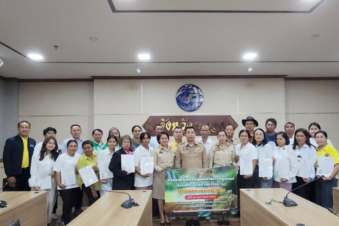 ระยองมอบหนังสือตราสัญลักษณ์ GI แก่เกษตรกรชาวสวนทุเรียนหมอนทอง 23 ราย เป็นการการันตีทุเรียนหมอนทองปลูกในระยอง เพื่อสร้างความเชื่อมั่นในแหล่งที่มาของผลผลิตให้แก่ผู้บริโภค