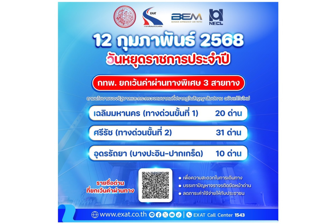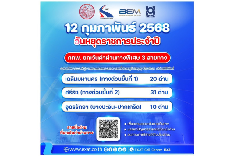 เมื่อวันที่ 12 ก.พ.68 การทางพิเศษแห่งประเทศไทย (กทพ.) กระทรวงคมนาคมแจ้งว่า ยกเว้นค่าผ่านทางพิเศษของทางพิเศษรวม 3 สายทาง ดังนี้