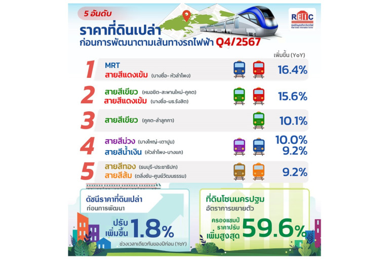 นอกจากนี้ REIC ยังได้จัดอันดับราคาที่ดินเปล่าก่อนการพัฒนาในแนวเส้นทางที่มีรถไฟฟ้าผ่าน พบว่าทำเลที่มีอัตราการขยายตัวของราคาที่ดินเพิ่มขึ้นสูงสุดเมื่อเทียบกับไตรมาสเดียวกันของปีก่อน (YoY) ส่วนใหญ่เป็นที่ดินที่มีโครงการรถไฟฟ้าเปิดให้บริการแล้ว และเป็นทำเลที่มีสถานีเชื่อมต่อระหว่างสถานีรถไฟฟ้าหรือสามารถเดินทางเชื่อมถึงกันได้ง่าย