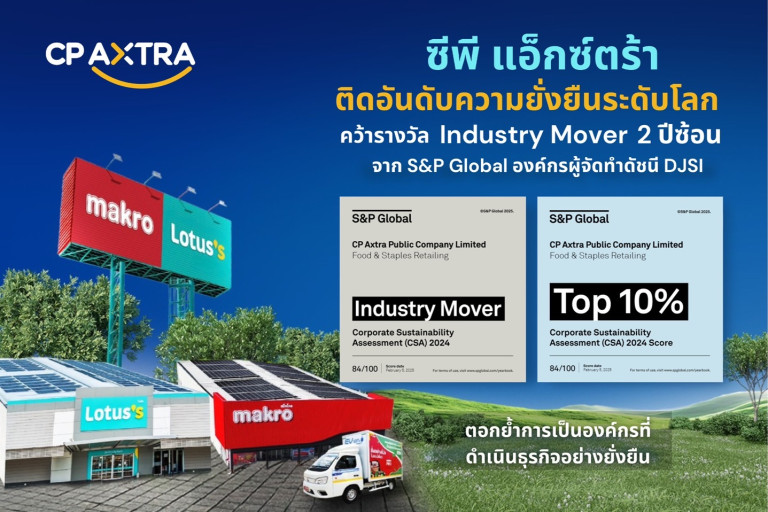 ‘ซีพี แอ็กซ์ตร้า’ ติดอันดับความยั่งยืนโลก ระดับ “Top 10%” พร้อมคว้ารางวัล Industry Mover สองปีซ้อน ในกลุ่มอุตสาหกรรม Food & Staples Retailing จาก S&P Global องค์กรผู้จัดทำดัชนี DJSI