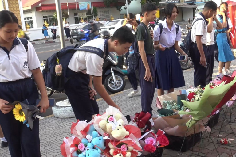 ดอกไม้วันวาเลนไทน์ปีนี้แพงกว่าปีที่ผ่านมา แม่ค้านำไปวางขายหน้าโรงเรียนนักเรียนซื้อมอบให้เพื่อนๆแบบประหยัด ราคาดอกกุหลาบเริ่มที่ดอกละ 50 บาท ทำเป็นช่อๆละ 100-200 บาท วันนี้นักเรียนมีสิ่งของให้เลือกแทนดอกไม้เป็นกำไลข้อมือสวยๆเพียง 39 บาท จึงหันมาซื้อกำไลข้อมือที่มีราคาถูกกว่าและมีสีสันสวยงามกว่าแทนดอกกุหลาบ