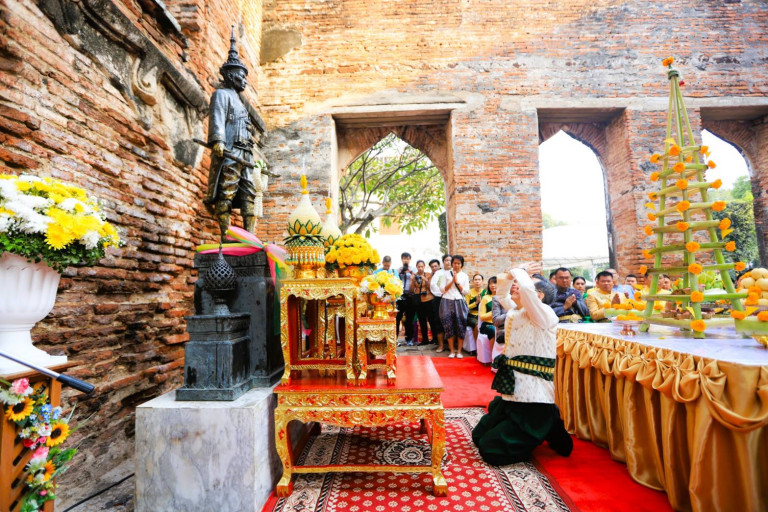 ผู้ว่าฯ ลพบุรี นำเหล่าพสกนิกร นุ่งโจง ห่มสไบ แต่งไทย ทำบุญตักบาตรถวายเป็นพระราชกุศลเพื่อน้อมรำลึกในพระมหากรุณาธิคุณของพระองค์ พร้อมทั้งรำบวงสรวง พระนารายณ์มหาราชและพระบาทสมเด็จพระจอมเกล้าเจ้าอยู่หัว