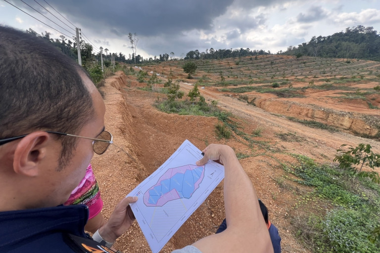 เมื่อเจ้าหน้าที่เดินทางไปถึงสวนทุเรียน พบผู้แลสวนเป็นหญิง 1 คน หญิงรายดังกล่าว จึงนำเอกสารแสดงขอบเขตแปลงสวนทุเรียนพร้อมหนังสือยินยอมการใช้สิทธิที่ดินจากเจ้าของเดิมให้กับเจ้าของใหม่ จากนั้นผู้แลสวนได้พาไปดูหลักเขตที่ดิน ซึ่งเป็นหลักเขต สปก. อีกแปลงที่ติดกัน และเมื่อตรวจสอบพื้นที่จากภาพถ่ายทางอากาศ พบว่า พื้นที่ทั้งหมด 215 ไร่ เป็นพื้นที่ในเขตป่าสงวนแห่งชาติป่าเขาสมิง (ป่าคลองใหญ่และป่าเขาไฟไหม้) และเขต สปก. แต่ได้มีการนำพื้นที่นี้เข้าร่วมโครงการสิทธิทำกิน แบ่งเป็นทั้งหมด 14 แปลง และมีหนังสือยิมยอมจากเจ้าของเดิมมาเป็นเจ้าของใหม่เพียงคนเดียว พร้อมแบ่งเนื้อที่เป็น 3 แปลง คือ แปลงที่ 1 เนื้อที่ 58 ไร่ 1 งาน 2 ตารางวา แปลงที่ 2 เนื้อที่ 102 ไร่ 2 งาน 65 ตารางวา และแปลงที่ 3 เนื้อที่ 45 ไร่ 3 งาน 49 ตารางวา โดยพื้นที่ทั้ง 3 แปลง ถูกปรับสภาพเป็นพื้นที่ปลูกทุเรียนแล้วทั้งหมด