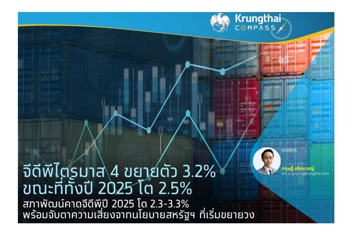 Krungthai COMPASS ประเมินเศรษฐกิจไทยในปี 2025 ความเสี่ยงจากสงครามการค้าที่มีแนวโน้มชัดเจนมากขึ้น อาจฉุดให้เศรษฐกิจไทยขยายตัวได้ต่ำกว่า 2.8% หลังสหรัฐฯเริ่มดำเนินมาตรการกีดกันทางการค้าที่ขยายวงมากขึ้น อาจกระทบโมเมนตัมเศรษฐกิจไทยในช่วงครึ่งปีแรกให้ขยายตัวได้ต่ำกว่าที่ประเมินไว้เดิม นอกจากนี้ไทยยังเผชิญกับการแข่งขันที่สูงจากจีนทั้งในตลาดส่งออกและในประเทศ และปัญหาการส่งออกที่ขยายตัวไม่ส่งผ่านผลดีไปสู่ภาคการผลิต จีดีพีไตรมาส 4/2024 เร่งตัวขึ้น 3.2%YoY ตามการส่งออกสินค้าและการท่องเที่ยวเป็นสำคัญ ประกอบกับการลงทุนภาครัฐที่เร่งตัวขึ้น