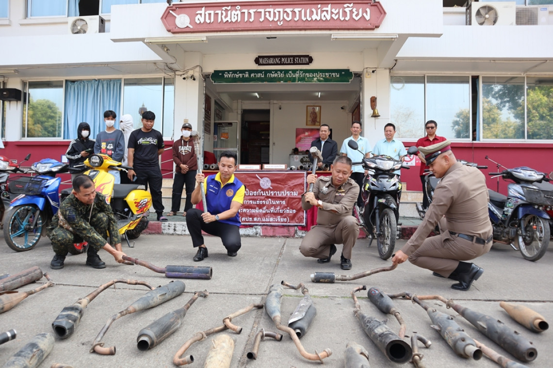 สภ.แม่สะเรียง จ.แม่ฮ่องสอน กำราบเด็กแว้นสร้างความรบกวนต่อประชาชน จับยึดท่อไอเสียผิดกฎหมาย แต่งซิ่งเสียงดัง บดทำลายท่อไอเสียรถจักรยานยนต์ 52 รายการ