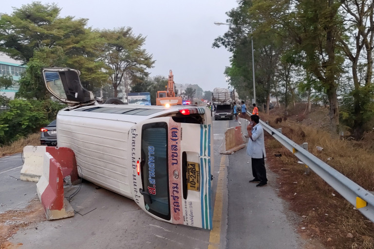 ระทึกอุบัติเหตุซ้ำซ้อน รถตู้โดยสารสุพรรณ-กรุงเทพฯชนแบริเออร์คว่ำเจ็บระนาว