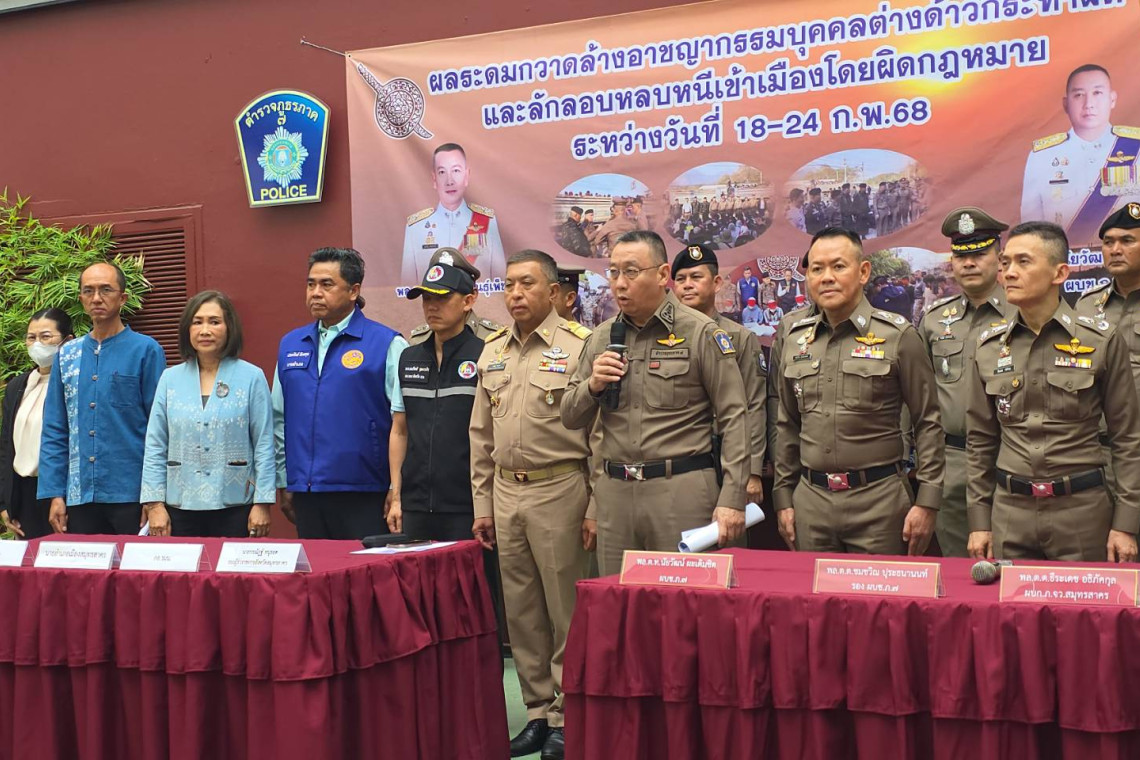 พล.ต.ท.นัยวัฒน์ ผะเดิมชิต ผบช.ภ.7 เปิดเผยว่า ตามนโยบายของรัฐบาล และ ผู้บัญชาการตำรวจแห่งชาติ ได้กำชับการปฏิบัติตามกฎหมายว่าด้วยคนเข้าเมืองเพื่อแก้ไขปัญหาอาชญากรรมโดยมุ่งเน้นจับกุมการกระทำความผิดของคนต่างด้าว เกี่ยวกับคนต่างด้าวที่มีหมายจับ การลักลอบหลบหนีเข้าเมืองโดยผิดกฎหมาย การอนุญาตสิ้นสุด หรือถูกเพิกถอนการอนุญาต หรือฝ่าฝืนกฎหมายเกี่ยวกับคนเข้าเมือง กฎหมายอาญา กฎหมายการทำงานของคนต่างด้าว การทำงานในลักษณะนอมินีหรือกฎหมายอื่นๆ โดยกำหนดให้มีการระดมกวาดล้างอาชญากรรมในพื้นที่รับผิดชอบในห้วงระหว่างวันที่ 18 – 24 กุมภาพันธ์ 2568 ซึ่งในส่วนของจังหวัดสมุทรสาคร ภายใต้กองกำกับการสืบสวนภูธรจังหวัด ที่ได้ร่วมกับภาคส่วนต่างๆ นั้น จากการรายงานพบการกระทำความผิดเกี่ยวกับคนต่างด้าว ประกอบด้วย การทํางานของคนต่างด้าว (กรณีต่างด้าวทำงานโดยไม่ได้รับอนุญาต) 4 ราย, พ.ร.บ.คนเข้าเมือง(กรณีต่างด้าวหลบหนีเข้าเมืองหรืออยู่ในราชอาณาจักรไทยโดยไม่ได้รับอนุญาต)164 ราย, พ.ร.บ.คนเข้าเมือง (กรณีเจ้าบ้านหรือต่างด้าวไม่แจ้งที่พักอาศัย) 50 ราย,พ.ร.บ.อาวุธปืนและเครื่องกระสุนปืน (กรณีต่างด้าวครอบครองอาวุธปืน) 4 ราย,พ.ร.บ.การพนัน (กรณีต่างด้าวเล่นการพนัน) 4 ราย,พ.ร.บ.ยาเสพติด (กรณีต่างด้าวกระทำความผิดเกี่ยวกับยาเสพติด) 6 ราย และ ประมวลกฎหมายอาญา (กรณีต่างด้าว ฆ่าผู้อื่น) 2 ราย รวมทั้งสิ้น 234 ราย