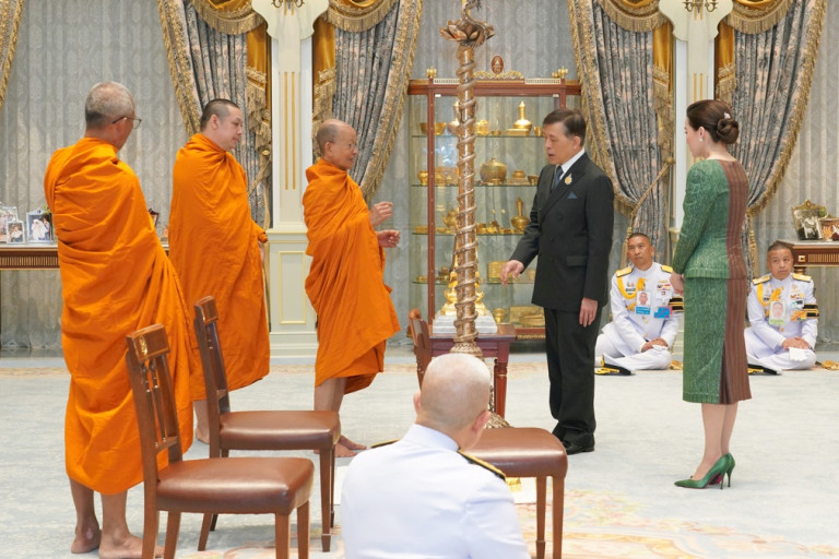 วันที่ 25 ก.พ.68 เวลา 18.59 น. พระบาทสมเด็จพระเจ้าอยู่หัว และสมเด็จพระนางเจ้า ฯ พระบรมราชินี เสด็จออก ณ พระที่นั่งอัมพรสถาน พระราชวังดุสิต พระราชทานพระบรมราชวโรกาสให้ พระพรหมวชิรากร (สุนทร สุนฺทราโภ) เจ้าอาวาสวัดราชผาติการาม พร้อมด้วย พระครูวิจิตรสีลาภรณ์ (ปราณี สุปภาโต) เจ้าอาวาส วัดป่าสิริวัฒนวิสุทธิ์ ในสมเด็จพระเจ้าพี่นางเธอ เจ้าฟ้ากัลยาณิวัฒนา กรมหลวงนราธิวาสราชนครินทร์ จังหวัดนครสวรรค์ และพระสงฆ์ เฝ้า ถวายเสาเทียนชัยมงคลเนื้อทองสัมฤทธิ์ พร้อมฐานรองรับ ซึ่งทำจากไม้มงคล 3 ชนิด ได้แก่ ไม้สักทอง ไม้พะยูง และไม้ขนุน แกะสลักลายไทยปิดทองคำเปลว เพื่อใช้บรรจุเทียนชัยมงคลสำหรับจุดถวายพระพร พระบาทสมเด็จพระเจ้าอยู่หัว และถวายพระแผนที่ประเทศไทย เนื่องในโอกาสพระราชพิธีมหามงคลเฉลิมพระชนมพรรษา 6 รอบ 28 กรกฎาคม 2567 เพื่อพระราชทานแก่วัดและเทวสถาน ตามพระราชอัธยาศัย
