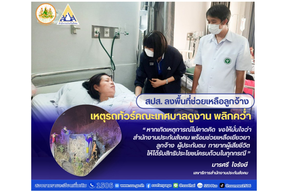 จากเมื่อวันที่ 26 ม.ค.68 เวลาประมาณ 04.00 น. เกิดอุบัติเหตุรถทัวร์ของคณะศึกษาดูงานจากสำนักงานเทศบาลอำเภอพรเจริญ จังหวัดบึงกาฬ เสียหลักพลิกคว่ำ บริเวณศาลปู่โทน ตำบลบุพราหมณ์ อำเภอนาดี จังหวัดปราจีนบุรี ขณะเดินทางไปดูงานที่จังหวัดระยอง พบว่า มีผู้เสียชีวิต 19 ราย และบาดเจ็บ 30 ราย นายพิพัฒน์ รัชกิจประการ รัฐมนตรีว่าการกระทรวงแรงงาน ได้แสดงความห่วงใย พร้อมมอบหมายให้สำนักงานประกันสังคมตรวจสอบข้อเท็จจริง ทั้งนี้ ได้กำชับการให้ความช่วยเหลือเยียวยาด้านสิทธิประโยชน์ต่อครอบครัวผู้เสียชีวิตและผู้ได้รับบาดเจ็บ โดยทายาทผู้เสียชีวิตจะได้รับสิทธิประโยชน์รวมประมาณล้านกว่าบาท