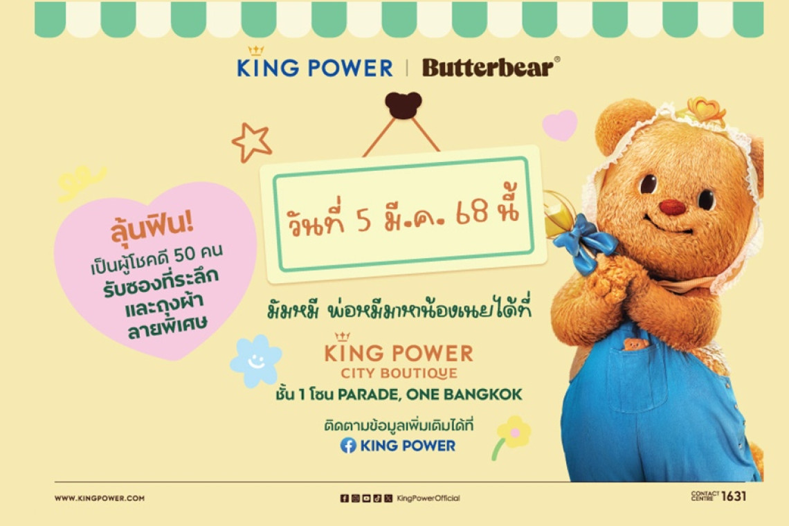 คิง เพาเวอร์ จัดกิจกรรมเอกซ์คลูซิฟ MEET & GREET กับ “น้องเนย” ในวันที่ 5 มีนาคม 2568 ตั้งแต่เวลา 17.00 น. เป็นต้นไป ที่ คิง เพาเวอร์ ซิตี บูทีก ชั้น 1 โซน PARADE โครงการ ONE BANGKOK ในบรรยากาศสุดอบอุ่นและเต็มไปด้วยความน่ารักเตรียมไว้เพื่อแฟน ๆ โดยเฉพาะ พิเศษ! สำหรับ 1,000 ท่านแรก ลงทะเบียนร่วมกิจกรรมในวันงาน รับฟรี! ซองที่ระลึกน้องเนยลายพิเศษ และ คูปองส่วนลดเพื่อนำไปใช้ที่ร้าน KING POWER BUTTERBEAR ที่ คิง เพาเวอร์ ท่าอากาศยานสุวรรณภูมิ พร้อมลุ้น! เป็นผู้โชคดี 50 ท่าน ที่จะได้รับถุงผ้าสุดพิเศษกับมือน้องเนยภายในงาน ติดตามข้อมูลเพิ่มเติมได้ที่ FACEBOOK: KING POWER