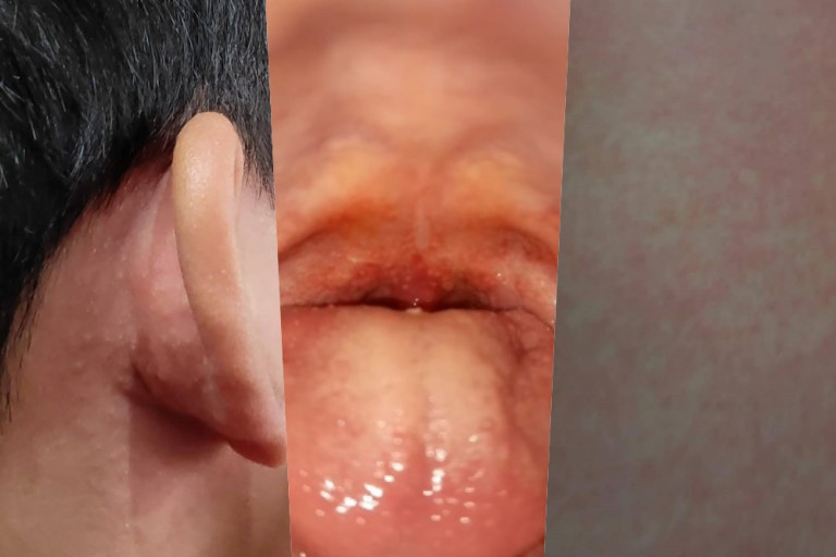 • ผื่นแดงสากคล้ายกระดาษทราย เริ่มจากลำตัวและกระจายไปแขนขา มักไม่ขึ้นที่ใบหน้า แต่แก้มจะแดงและมีวงซีดรอบปาก