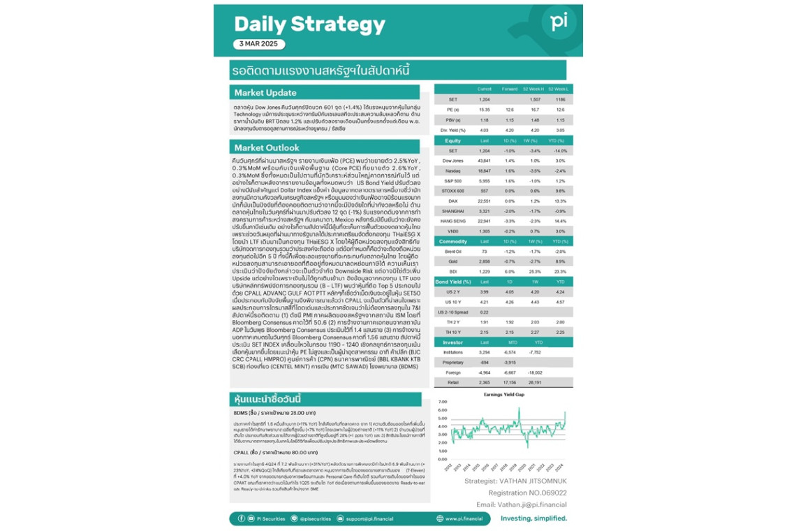 เมื่อวันที่ 3 มี.ค.68 บล.พาย เผยว่าตลาดหุ้น Dow Jones คืนวันศุกร์ปิดบวก 601 จุด (+1.4%) ได้แรงหนุนจากหุ้นในกลุ่ม Technology แม้การประชุมระหว่างทรัมป์กับเซเลนสกีจะประสบความล้มเหลวก็ตาม ด้านราคาน้ำมันดิบ BRT ปิดลบ 1.2% และปรับตัวลงรายเดือนเป็นครั้งแรกตั้งแต่เดือน พ.ย. นักลงทุนจับตารอดูสถานการณ์ระหว่างยูเครน / รัสเซีย
