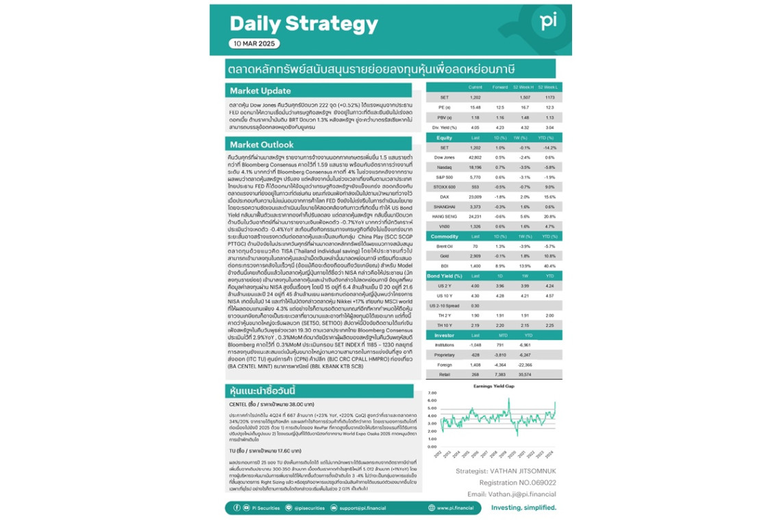 เมื่อวันที่ 10 มี.ค.68 ตลาดหุ้น Dow Jones คืนวันศุกร์ปิดบวก 222 จุด (+0.52%) ได้แรงหนุนจากประธาน FED ออกมาให้ความเชื่อมั่นว่าเศรษฐกิจสหรัฐฯยังอยู่ในภาวะที่ดีและยืนยันไม่เร่งลดดอกเบี้ย ด้านราคาน้ำมันดิบ BRT ปิดบวก 1.3% หลังสหรัฐฯขู่จะคว่ำบาตรรัสเซียหากไม่สามารถบรรลุข้อตกลงหยุดยิงกับยูเครน